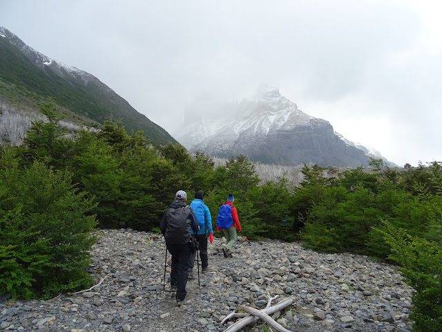 I slept very well in my tent - it was surprisingly warm and cozy! After a good breakfast, we started our next hike. Unfortunately, the weather had changed. It was cold and raining. But we were in Patagonia, so this was normal. No complaints. After a short drive in the bus, we took a boat that brought us to our next campsite - the Campamento Paine Grande. It was much bigger than the one last night (which one we had for ourselves), but with a great view as well. We let our bags there and started the hike in the French Valley. Today with a lot more layers on. We even had light snow!